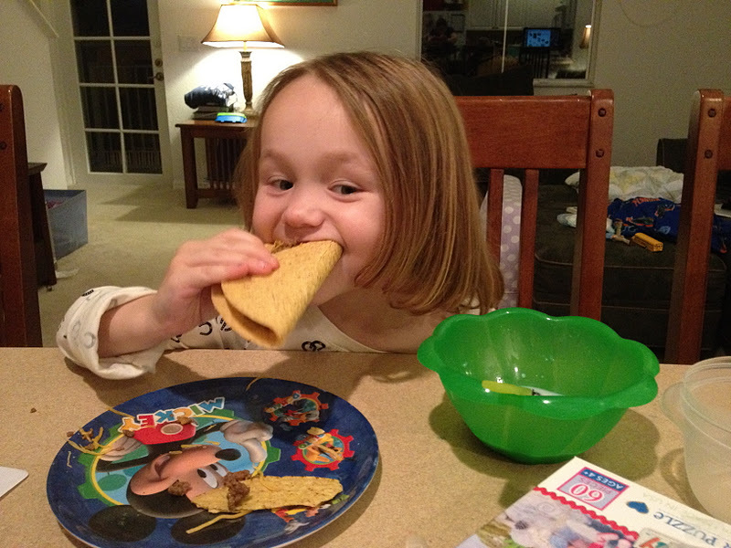 Then they ate dinner together at the table. Ri thinks he is so big because he can climb up and sit in a big boy chair. Rea requested cereal and milk - she said Grandpa ate some this morning when she was at Grammie's. She added fresh blueberries. I made tacos for me and Shane. Rea saw me putting one together and said, "I like tacos." So we made one for her. She actually ate half.